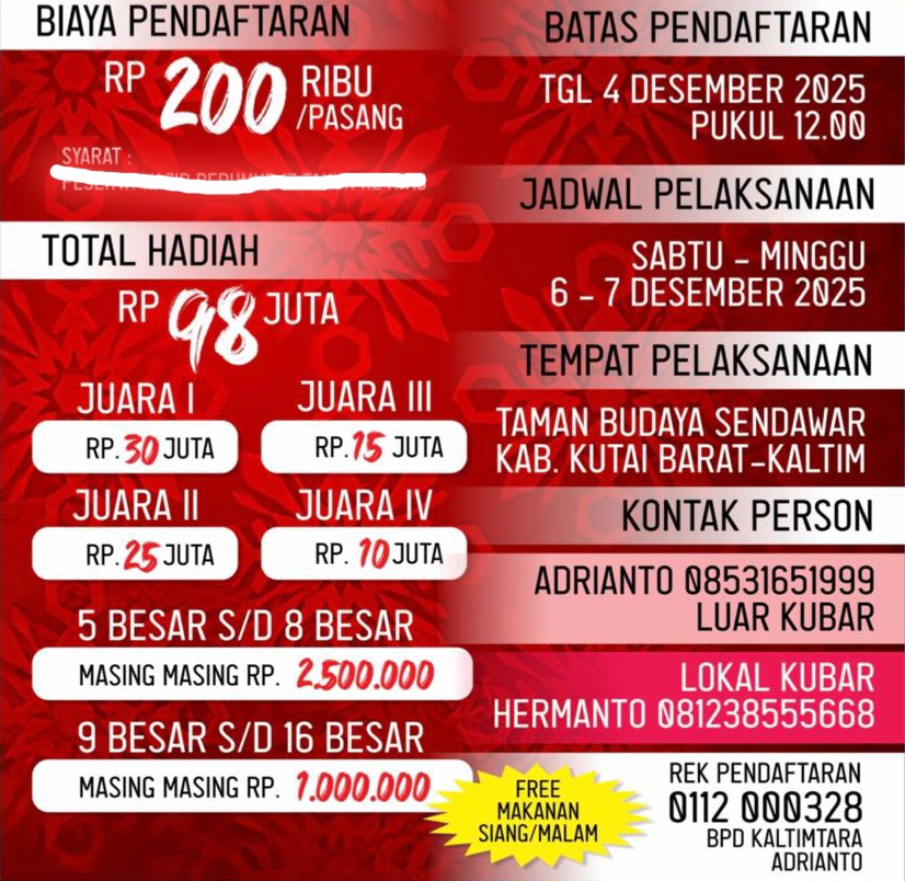 Dia menjelaskan, pendaftaran turnamen domino ini telah dibuka sejak Senin 3 November 2025 dan berakhir 4 Desember 2025, Pukul 12.00 WITA. ” Masih ada kesempatan untuk mendaftar Ayo buruan segera mendaftar bagi yang belum mendaftar sebelum ditutup,” tutupnya(*)