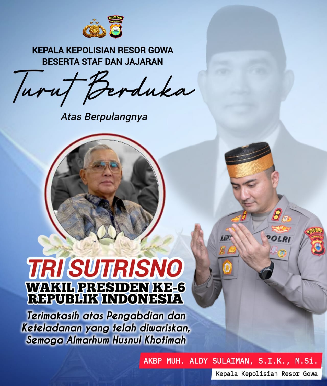 ππππ | π π π β Kepala Kepolisian Resor Gowa, AKBP Muhammad Aldy Sulaiman, S.I.K., M.Si., beserta staf dan seluruh jajaran Polres Gowa menyampaikan turut berduka cita yang mendalam atas berpulangnya Wakil Presiden ke-6 Republik Indonesia, Tri Sutrisno, Senin (02/3/2026).